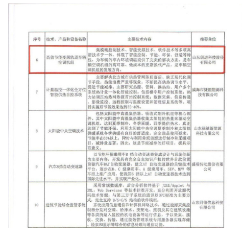 我公司“高效節能變頻軌道車輛空調機組”項目列入“山東省重點節能技術、產品和設備推廣目錄。